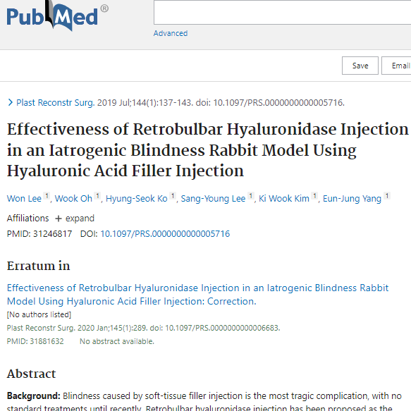 Hyaluronik asit ilişkili vasküler oklüzyon modelini simüle etmek için Yeni Zelanda Beyaz tavşanları kullanıldı. Retinal arter oklüzyonu oluşturmak için internal karotid artere 0,7 ila 1,6 ml’lik bir hyaluronik asit dolgusu enjekte edildi. Tavşanlara farklı obstrüksiyon sonrası zaman noktalarında (5 ve 10 dakika) retrobulber hiyalüronidaz (3000 IU) uygulandı. Kontrol grubuna herhangi bir müdahale yapılmadı.  Retrobulber hiyalüronidaz insanlar için etkili bir kanıta dayalı tedavi seçeneği olabilir. Hiyalüronidaz konsantrasyonu ve enjeksiyon süresi daha hızlı iyileşme için önemli faktörlerdir, ancak ek çalışmalara hala ihtiyaç vardır. Link