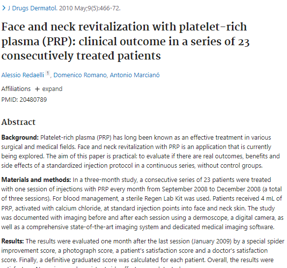 Üç aylık bir çalışmada, 23 hastadan oluşan ardışık bir seri, Eylül 2008’den Aralık 2008’e kadar her ay bir seans PRP enjeksiyonu (toplam üç seans) ile tedavi edildi. Kan yönetimi için steril bir Regen Lab Kiti kullanıldı. Hastalara yüz ve boyun derisine standart enjeksiyon noktalarından kalsiyum klorür ile aktive edilmiş 4 mL PRP uygulandı. Genel olarak sonuçlar tatmin ediciydi. Ciddi ve kalıcı bir yan etki tespit edilmedi. Link